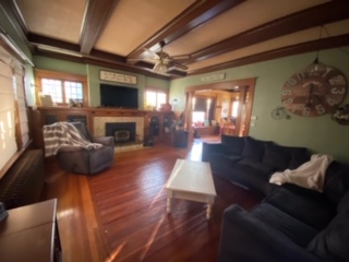 Open living room with wood stove